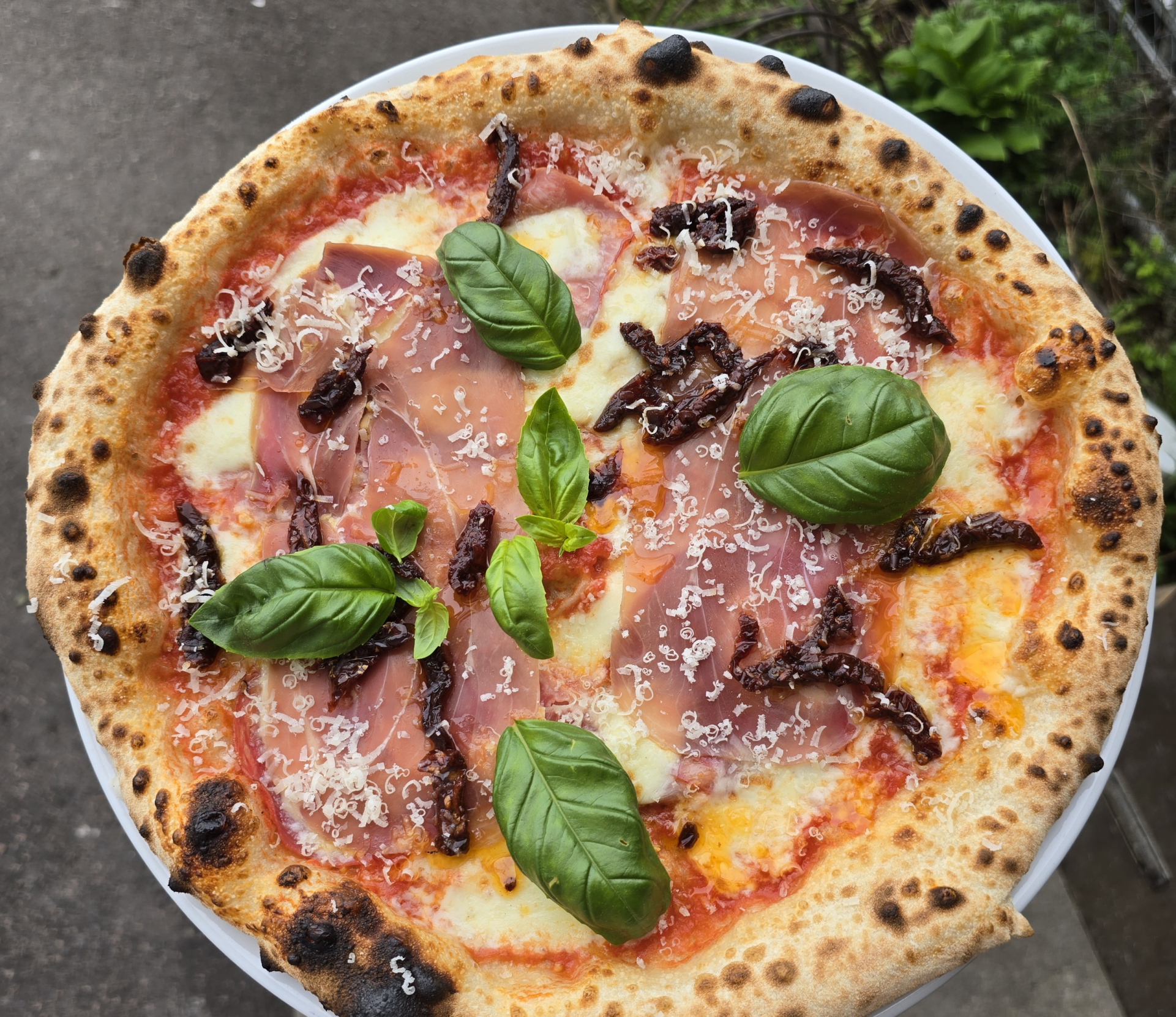 Prosciutto Crudoa(Parmankinkku), Aurinkokuivattu tomaatti, parmesaanijuusto, basilika.